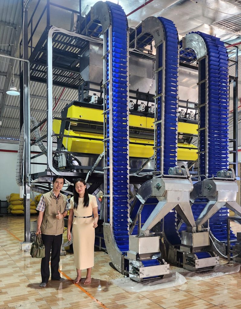 Giám đốc Nguyễn Thị Thanh Tâm cùng với Trưởng Ban kinh tế Môi trường và pháp luật điện tử bên dây chuyền đóng gói tại nhà máy